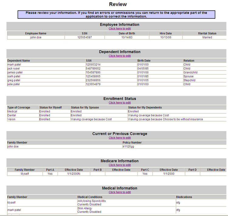 The employee is asked to review all information. They can access and edit any part of the application from this page.